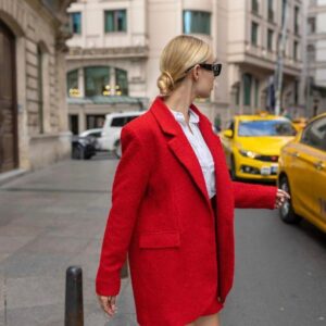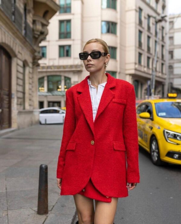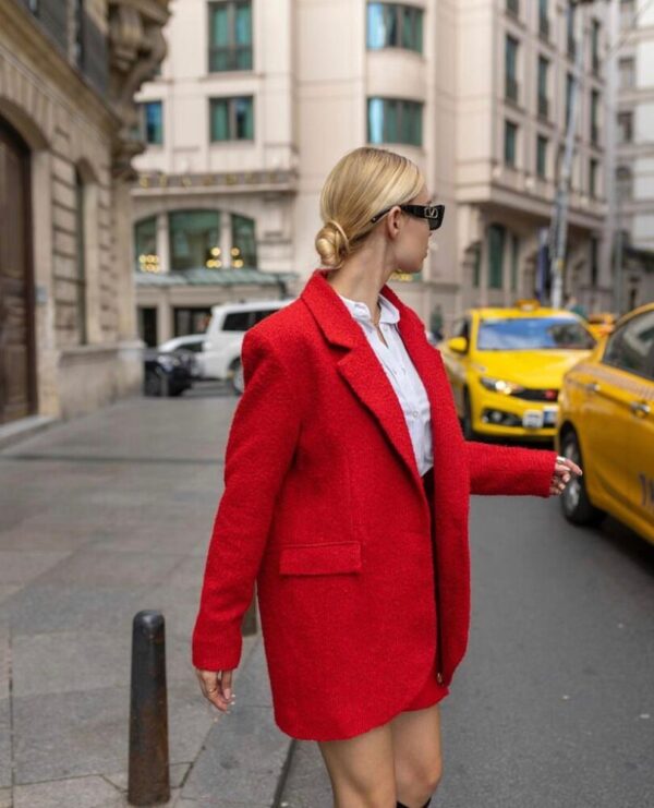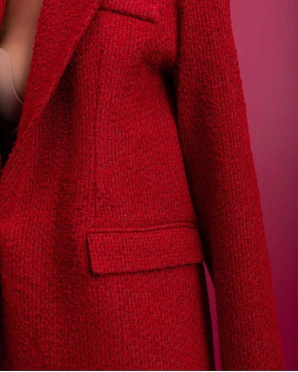 Σακάκι με διπλό γιακά, μακριά μανίκια. Ίσια γραμμή. Τσέπη που κλείνει. Λεπτομέρεια με χρυσό κουμπί.