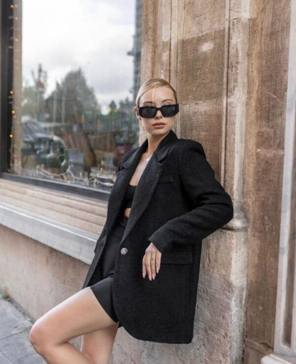Σακάκι με διπλό γιακά, μακριά μανίκια. Ίσια γραμμή. Τσέπη που κλείνει. Λεπτομέρεια με χρυσό κουμπί.